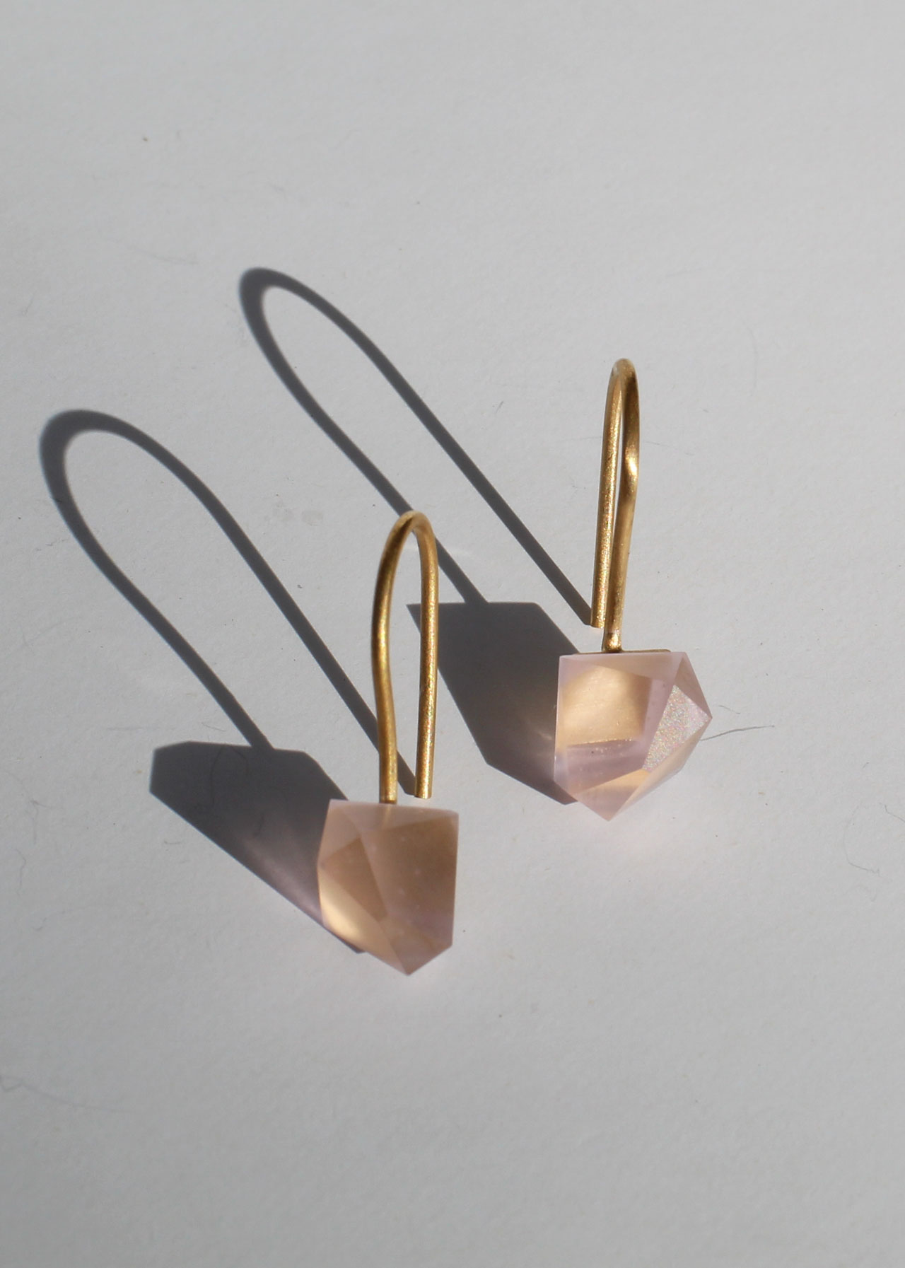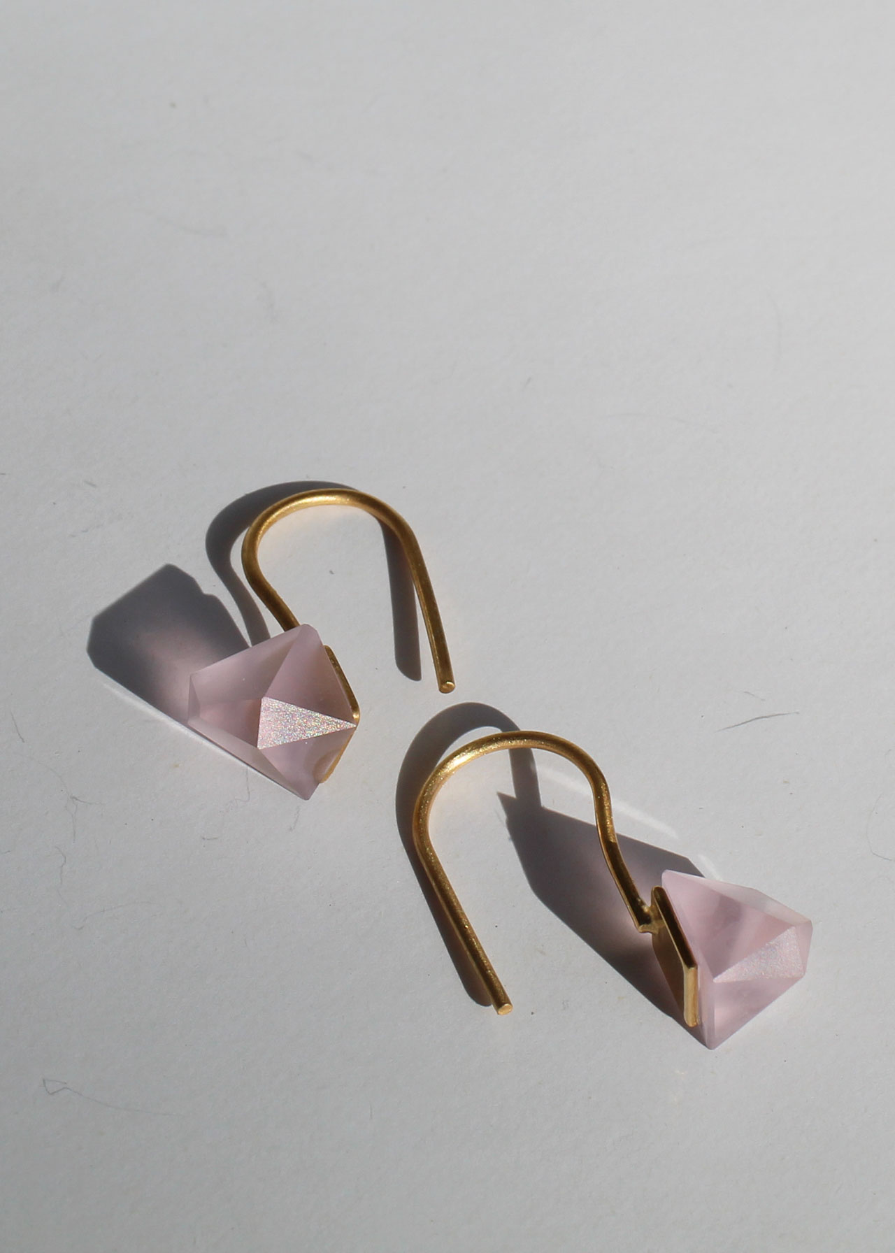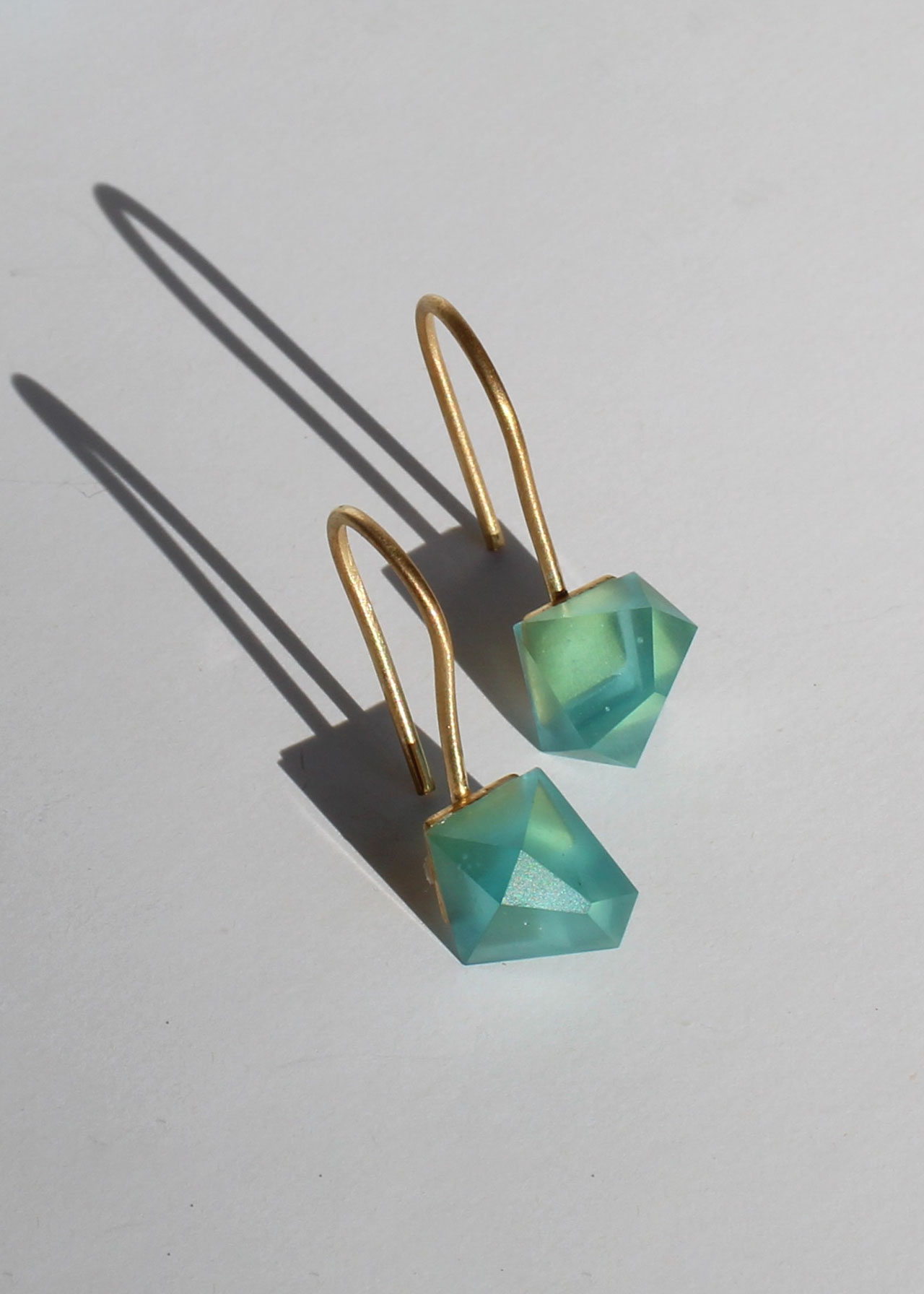Geometric earrings handcrafted in glass and finished with a short hook in 24 kt gold-plated 925 sterling silver (3 microns). Their faceted volume captures the light, revealing fresh translucent tones through subtle layers of color.